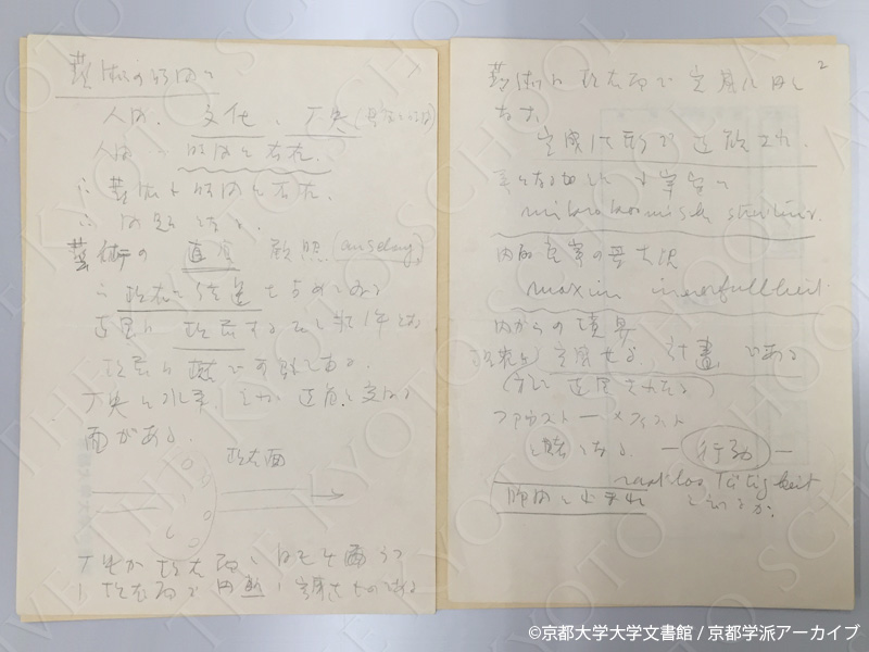 藤井さんとはお会いしないまま封書でのやり取りとなったが、その中でなんと「中井の史料は京大にもあります」という驚くべき返信をいただいた。中井家が持っていた史料を『京都大学大学文書館(以下、“文書館”)』に寄贈する際、藤井さんがいろいろな手続きを請け負ったらしい。こんな身近なところに中井の史料があったとは!さらに、中井の長女である岡田由紀子さんの連絡先も、藤井さんから教えていただいた。そこで岡田さんにも「京都学派アーカイブに、中井正一の史料を掲示させていただきたい」という主旨の手紙をお送りしたところ、岡田さんから非常に美しい文字で「父が喜んでいると思います。見守ってくれているような気がします」という丁寧なご快諾の返信をいただいた。