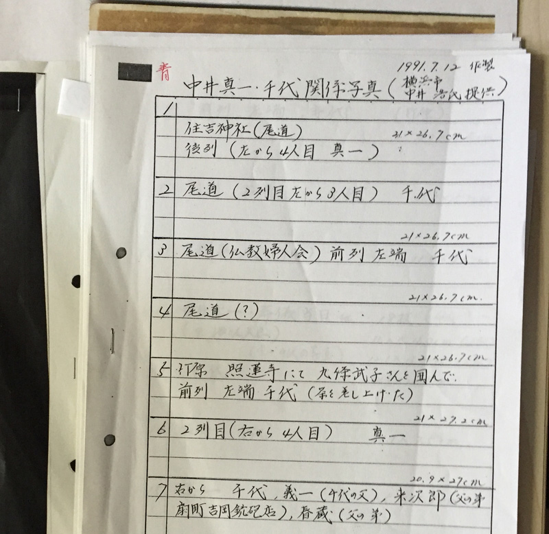 滞在時間が短かったため、どんな史料なのか内容をきちんと把握できないまま、とにかく写真を片端から撮らせてもらってきた。しかしよく見てみると、尾道の住吉神社など、私が子どもの頃によく遊んでいた場所も写っていて懐かしい。中井は竹原生まれで尾道育ちなので、もしかすると中井の育った家はうちのすぐ近所にあったのかもしれない。そして、訪問時は気づかなかったが、後から撮影したものを見てみると、史料が丁寧に整理・分類されているようで目録も作られていた。