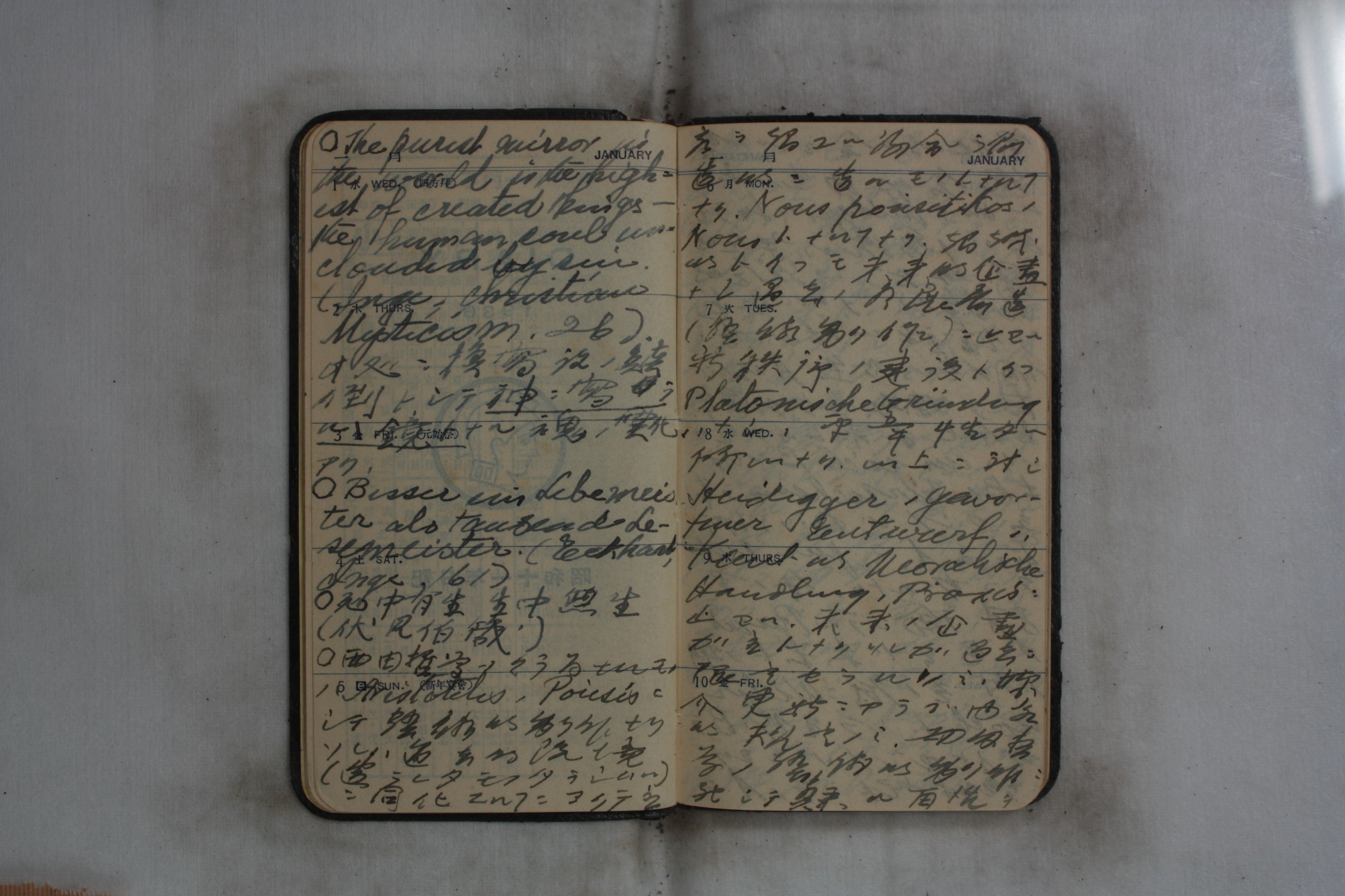 百冊余の手帳に書かれた日記あるいはメモ.スケジュール欄に主に哲学上のアイデアが書かれている.時に哲学以外の記述もみられる:例:1945年8月15日水曜日 日本無条件降伏. 正午主上放送. 痛憤.各冊の終わりには家事の記載も(印税など収入の計算,購入書籍のリスト).この資料群には推敲用メモ,夫人の住所録など,日記ではないものも数冊混じっている.GAIR資料 GAIR資料で十分読めるものが多い.しかし,GAIRのマイクロフィルム画像ではほとんど読めない場合もあり,また,読める場合も当アーカイブのカラー画像の方が読みやすい.色鉛筆も使われているが,GAIRの資料はモノクロ.一部の手帳でGAIRにはないものがある. | |||